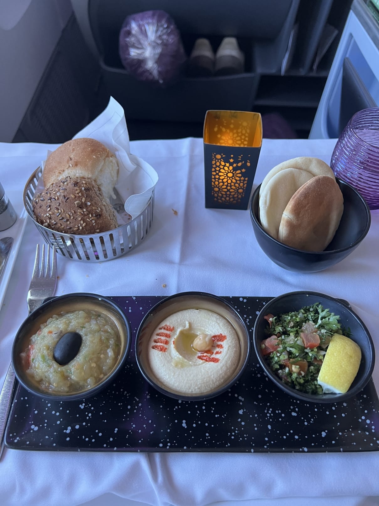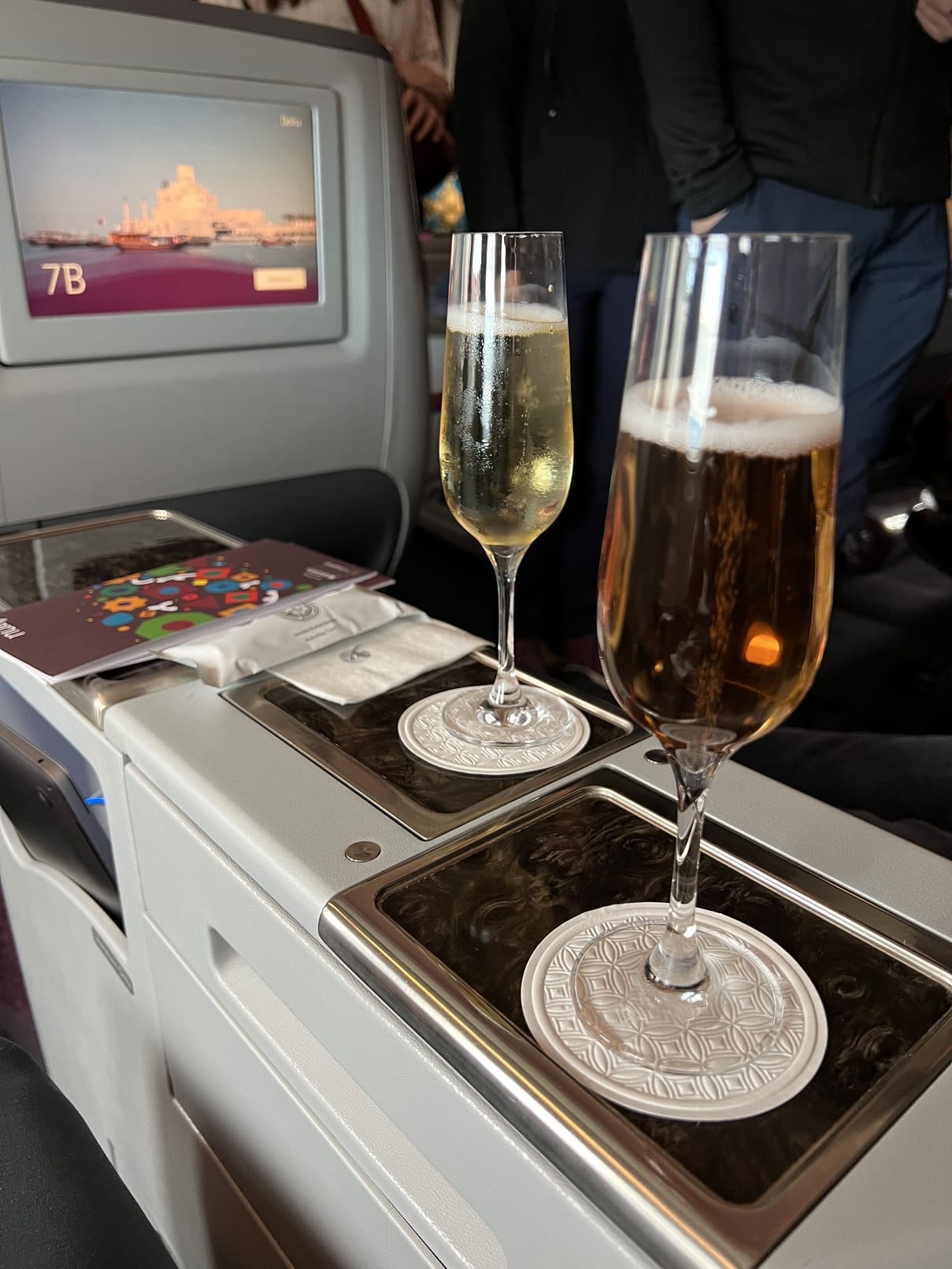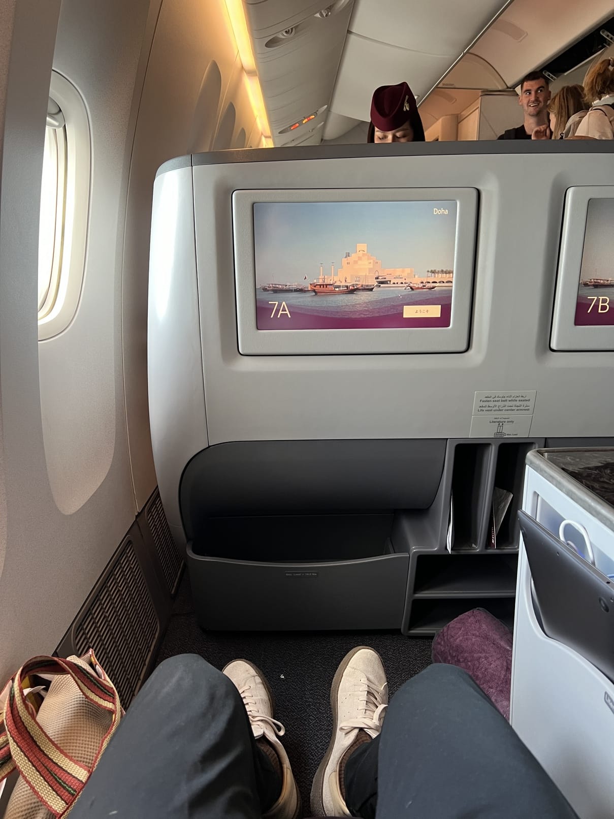 De vlucht naar Doha werd uitgevoerd in wat sommige mensen een ‘gore ouwe bak’ noemen omdat het de meest gedateerde business class van Qatar Airways betreft (met een 2-2-2 opstelling zodat je, God verhoede, zelfs naast een vreemde terecht kan komen), maar ik zat naast een man op leeftijd die voor het eerst business class vloog en ik vond het helemaal geweldig omdat hij het zo geweldig vond. Hij kwam er bij het inchecken achter dat zijn schoonzoon—die piloot is bij de airline en zijn ticket had geregeld—een plekje aan de juiste kant van het gordijntje (dus vóór het gewone volk) had geregeld.