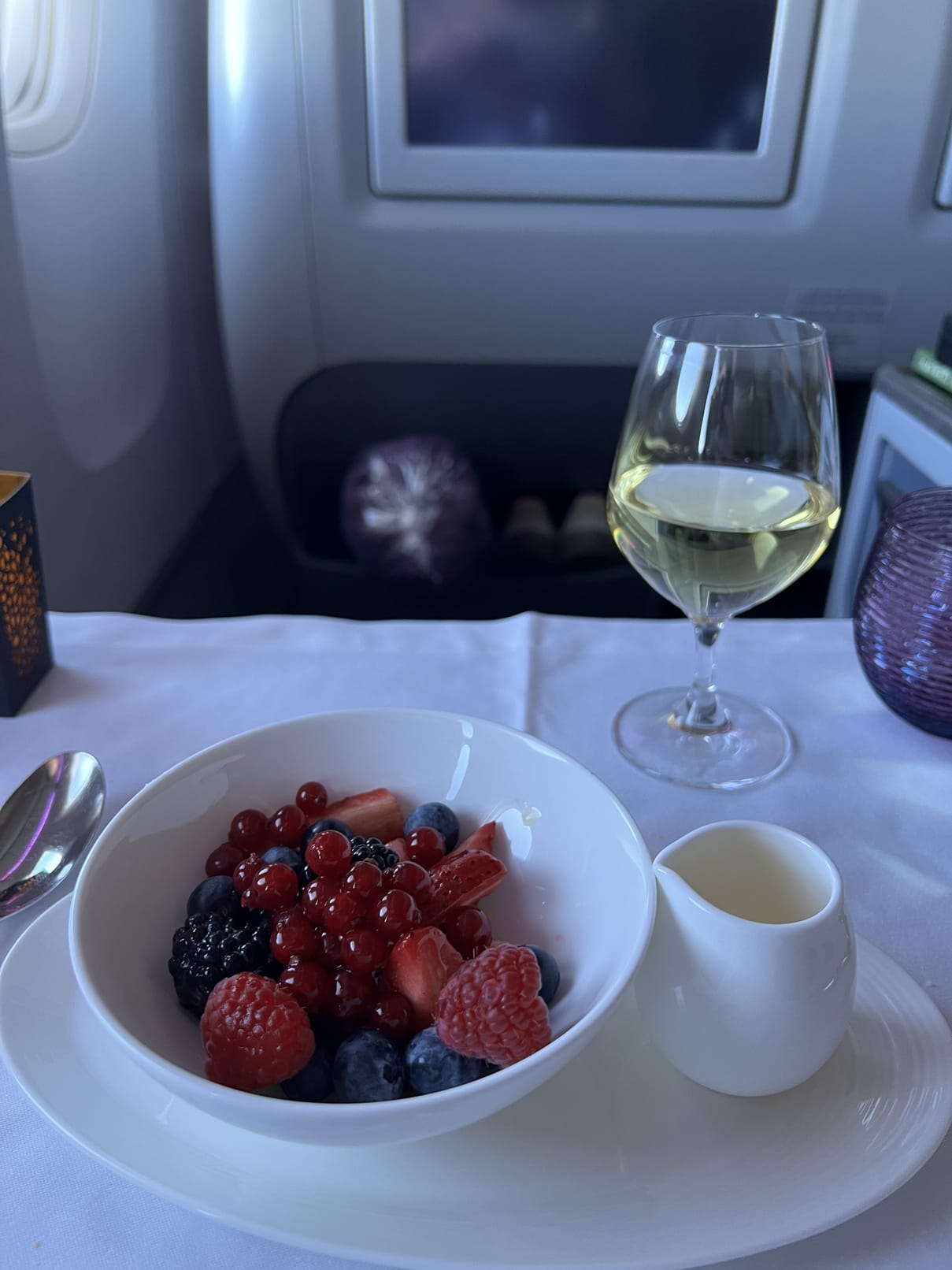 Hij nam het (de wijn) ervan en verzekerde mij dat hij het broodje gebakken ei in z’n tas er niet uit ging halen omdat het immers in business class bij Qatar Airways gebruikelijk is dat je kunt eten wanneer je wil en wat je wil (en zoveel als de voorraad aan boord toelaat).