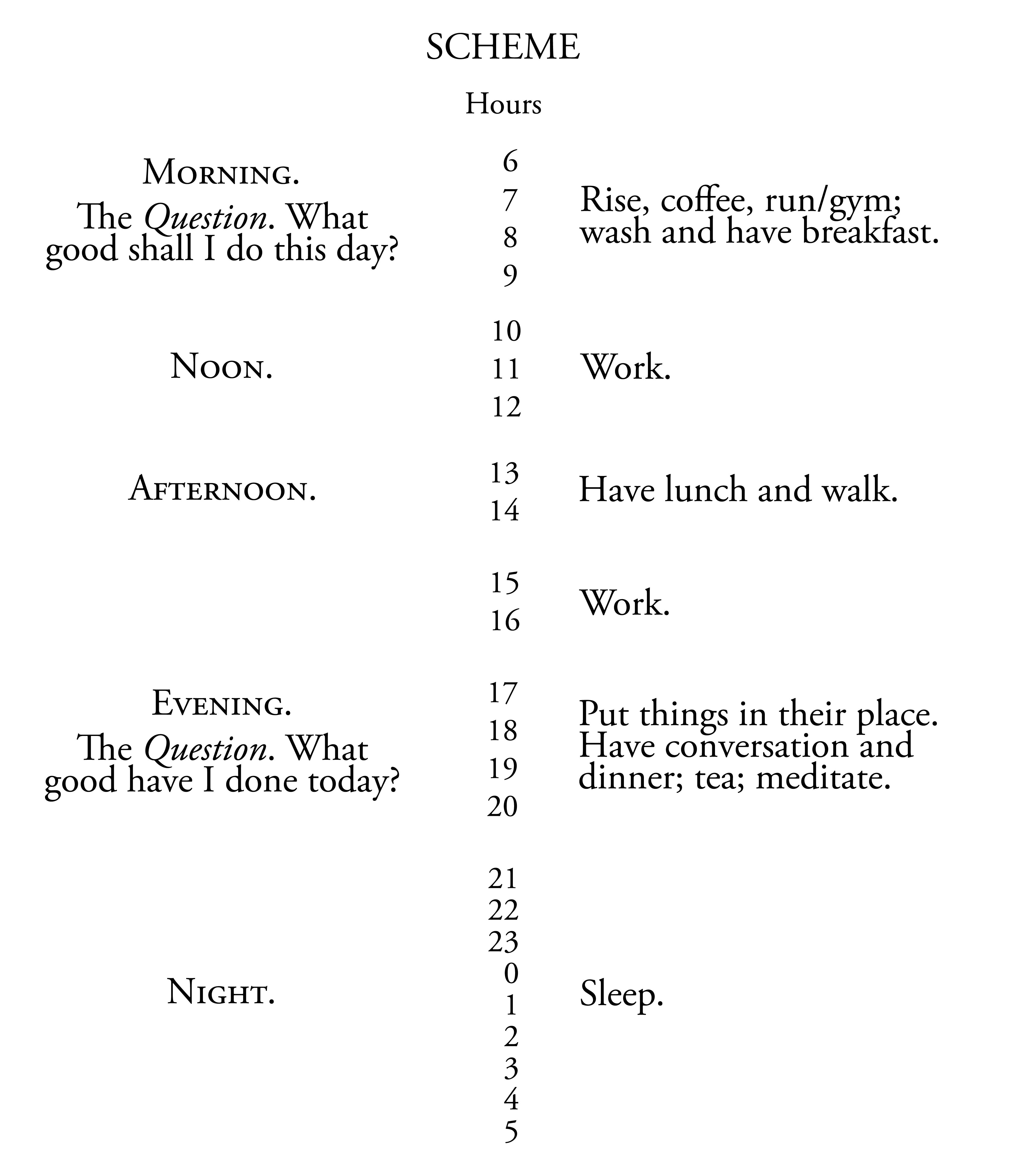 Het plan was om te gaan schrijven volgens een strak stramien, geïnspireerd op het luie leven van Benjamin Franklin. Met terugwerkende kracht denk ik dat hij ervan baalt dat er 146 jaar tussen zijn dood en de uitvinding van de lamineermachine zat want zijn dagschema zou prachtig aan beide zijden van een dun laagje plastic kunnen worden voorzien en in zo'n lullig houden staandertje passen.