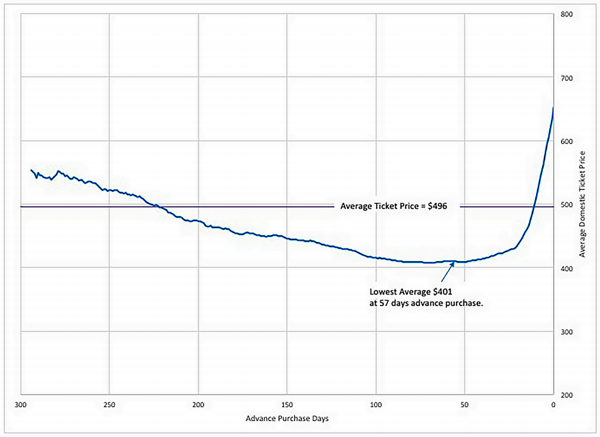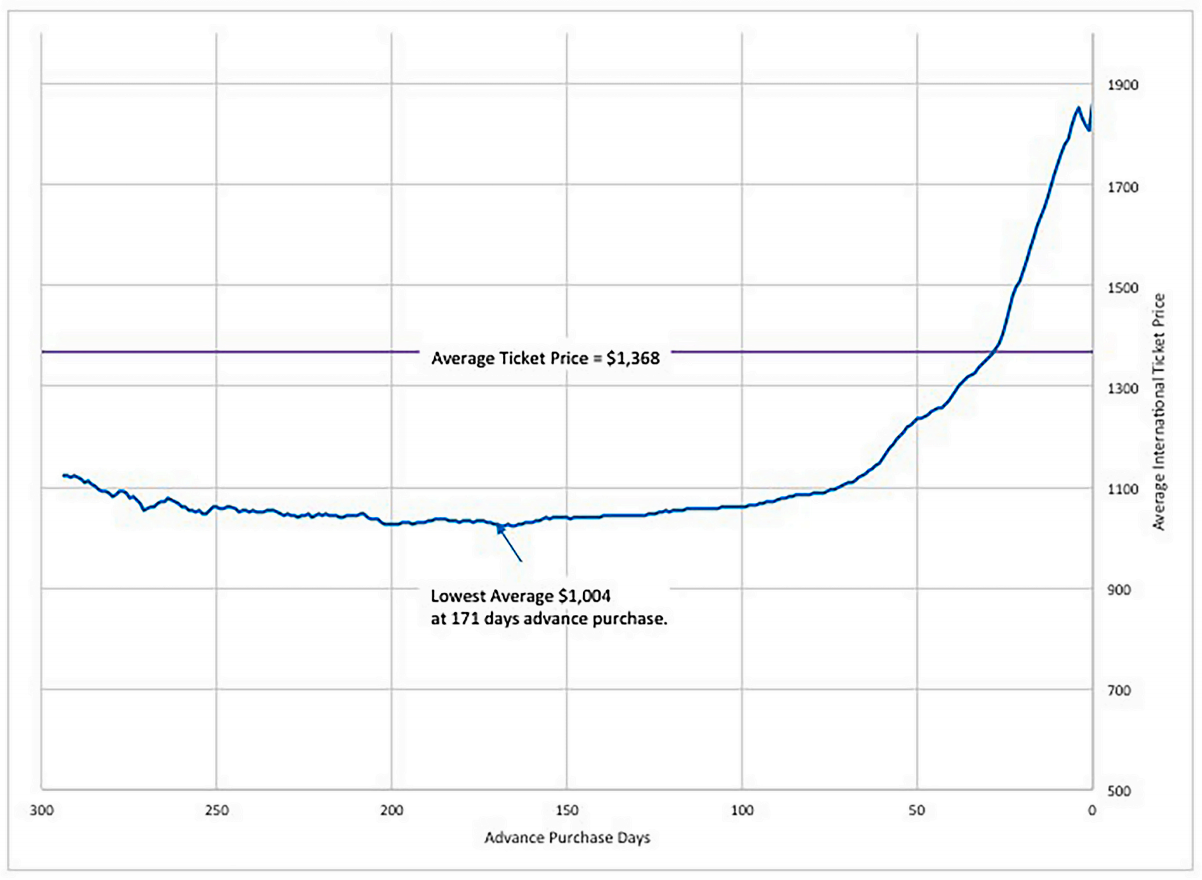 Dat zie je ook in deze grafieken waarin je ziet dat binnenlandse vluchten in de Verenigde Staten op de 57e dag voor vertrek gemiddeld het goedkoopste zijn en internationale vluchten op de 171e dag voor vertrek.