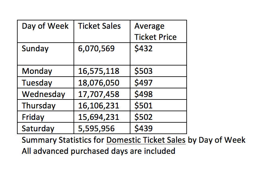 En er is ook nog steeds geen data die deze gekke tip ondersteunt. Behalve als je er naar zoekt. En wat zie je dan? Dat tickets juist gemiddeld goedkoper zijn in het weekend (maar dit zegt dus ook weer helemaal niks, want zakelijke reizigers zijn op zondag aan het hockeyen en prijsjesjagers zoals jij en ik zijn juist op zondag voordelige vliegtickets aan het zoeken).