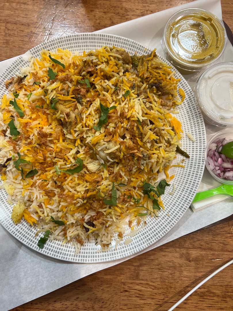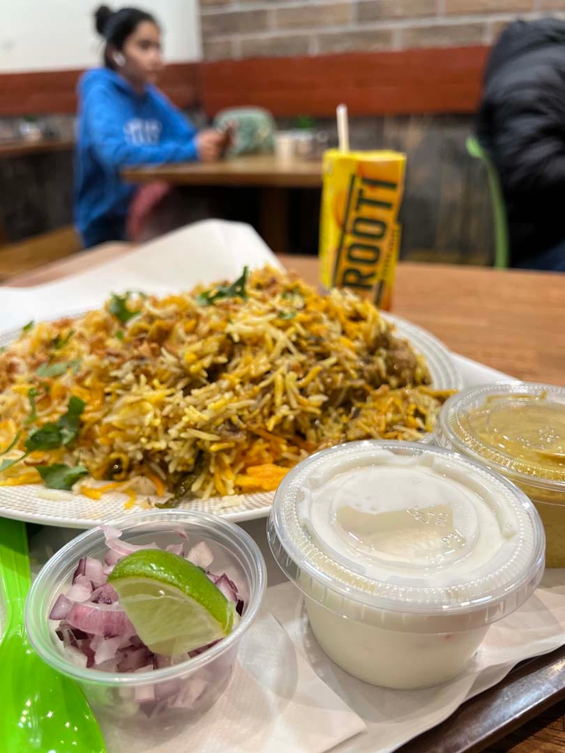 Toen stond ik weer op straat en mijn vlucht terug liet nog even op zich wachten. Ik opende Google Maps weer en typte indian food in en bleek niet meer dan 300 meter te hoeven lopen voor 3,9 sterren. Dat bleek wederom een gouden greep want het megabord biryani was uiteindelijk precies dat: 3,9/5 sterren. €20 inclusief fooi.