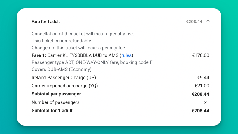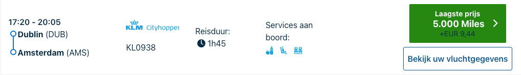 Je ziet dat het ticket is opgebouwd uit de ticketprijs zelf (de prijs die de airline rekent), een zogenaamde ‘Ireland Passenger Charge (UP) en de prettoeslag ‘Carrier-imposed surcharge (YQ)’. Als je het ticket boekt met Flying Blue miles, betaal je alleen de Ireland Passenger Charge (UP), die te vergelijken is met de Passenger Service Charge (RN) op Schiphol, maar die hier veel lager is. Er is ook geen aparte toeslag voor veiligheid (hoewel er wel veiligheidscontrole is) en ook geen toeslag die poogt om klimaatimpact te mitigeren. Zelfs de 'Carrier-imposed surcharge' komt in dit geval te vervallen.