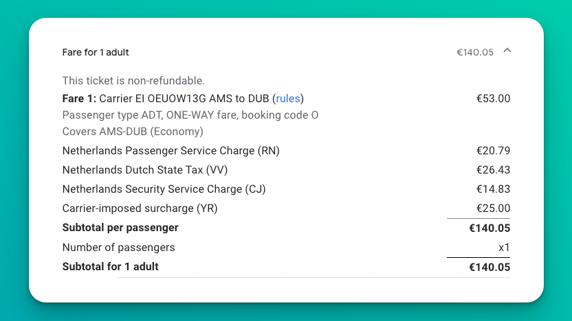 De vaste kosten voor een enkele reis bedragen dus al €20,79+€26,43+€14,83=€62,05 en dan heeft de airline er nog niets aan verdiend. De werkelijke kosten van een ticket komen hier nog bovenop. In het voorbeeld hierboven, van de Ierse airline Aer Lingus, betaal je de airline nog €53,00. Met de eerder genoemde €25,00 is dat dus €88 voor de airline. Deze constructie (prijs + één of meerdere toeslagen) geldt voor alle vluchten.