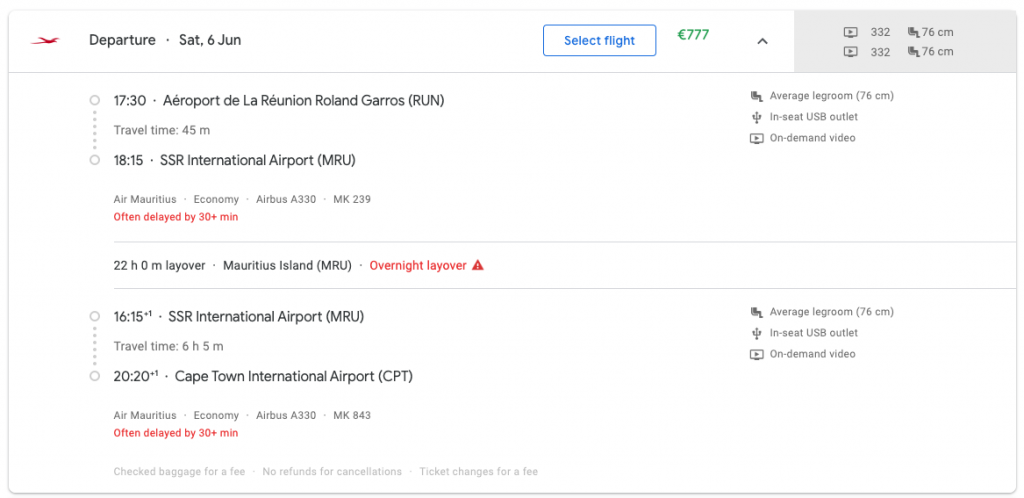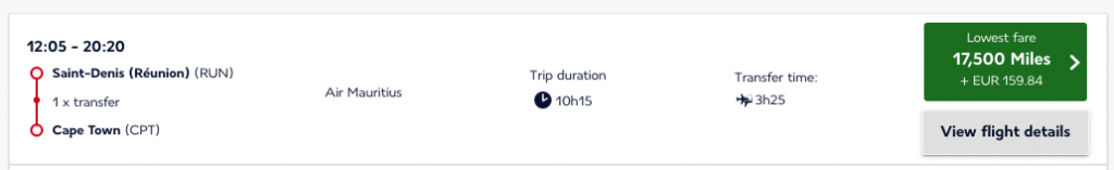 Frankrijk heeft niet alleen vingers in de caraïbische en pacifische pappen, maar ook in de Indische. Daar zijn twee eilanden te vinden met wat Franse invloeden: Réunion (RUN) en Mauritius (MRU). Vluchten tussen die eilanden, en tussen één van de twee eilanden en Johannesburg (of Kaapstad), zijn te boeken voor 16.500 punten in economy class. Dat is een leuke deal, vergeleken met gangbare prijzen in cash.