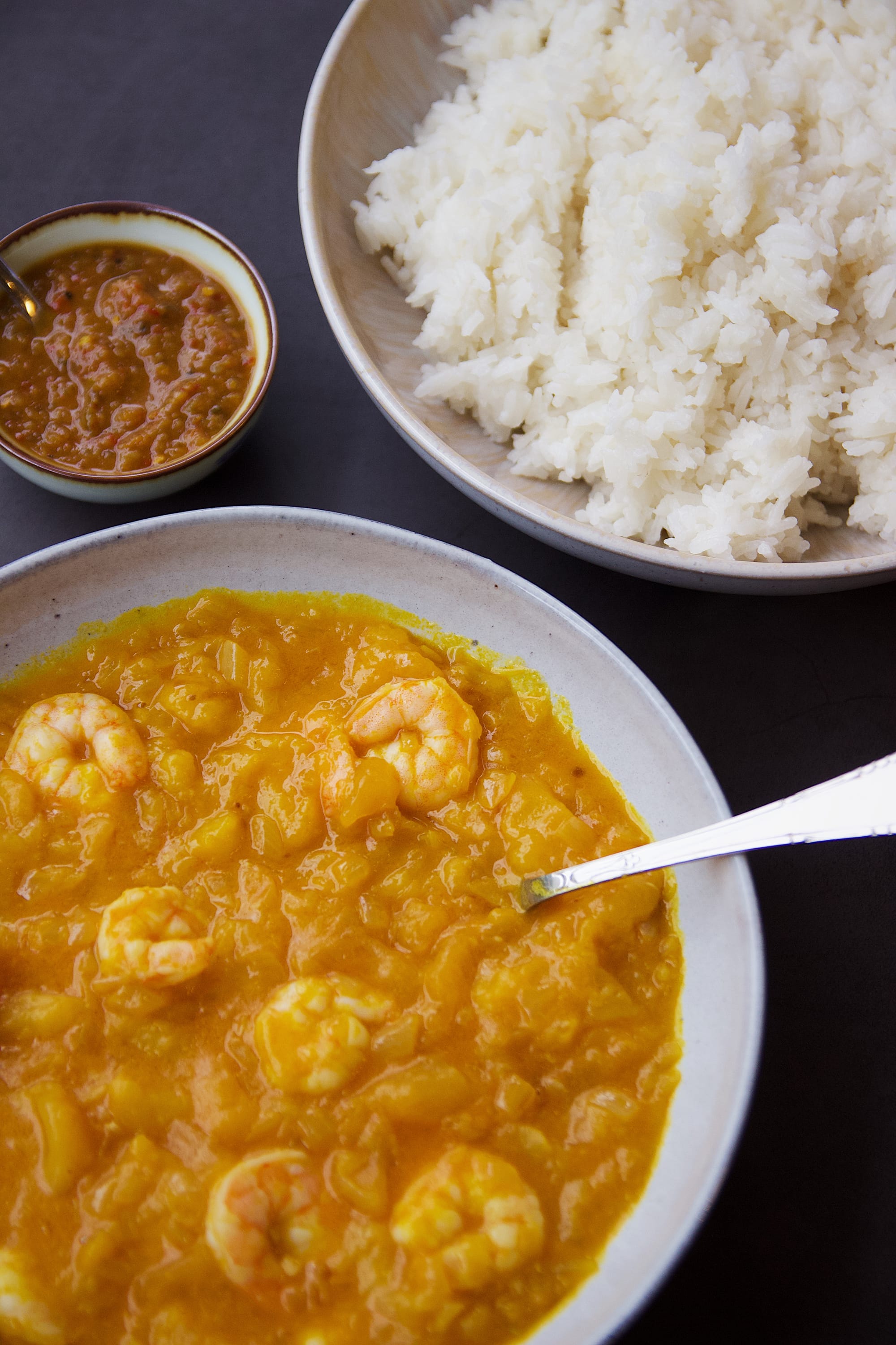 Dit is een recept uit Het Smakeloze Kwartier voor een gerecht met gekookte mango en garnalen. Best lekker, ook voor kleine kinderen!