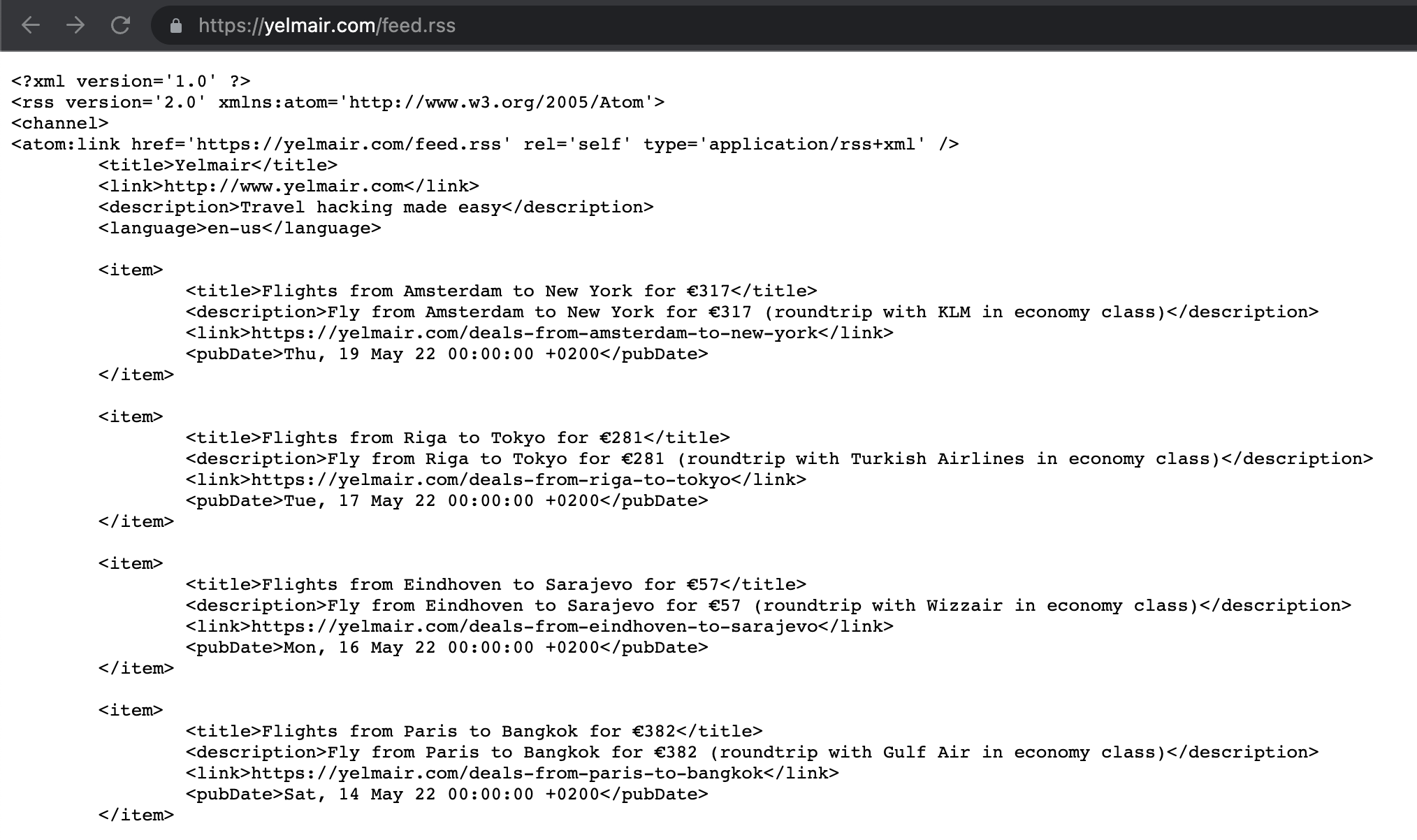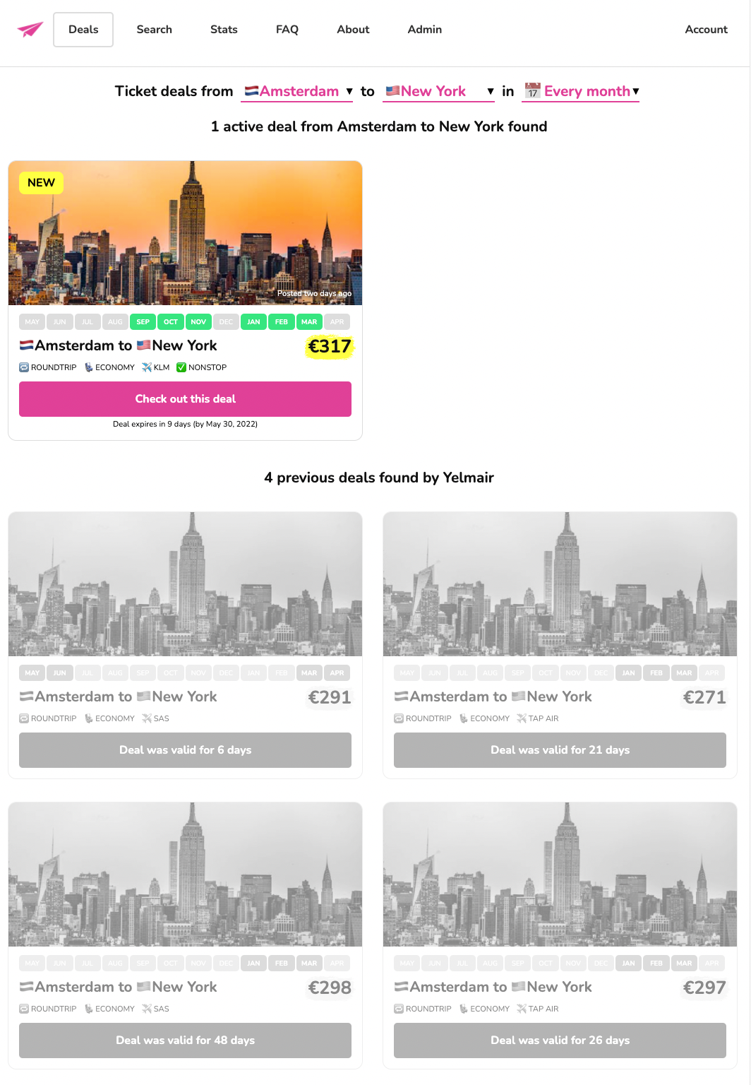 Yelmair is een idee dat, samen met databaseliefde, al jaren in mijn hoofd ronddartelde. Dat komt omdat ik ook al jaren ticketdealblogs volg. Websites als Secret Flying publiceren dagelijks meerdere vliegticketdeals, en promoten ze op sociale media en nieuwsbrieven. Dat vind ik tof en ik heb al menig vliegticket geboekt omdat ik een deal zag op sites als Secret Flying. Ik zou met enige voorzichtigheid kunnen zeggen dat ticketdealblogs mijn leven hebben veranderd door alle gekke reisroutes die ik heb genomen voor extreem weinig geld.