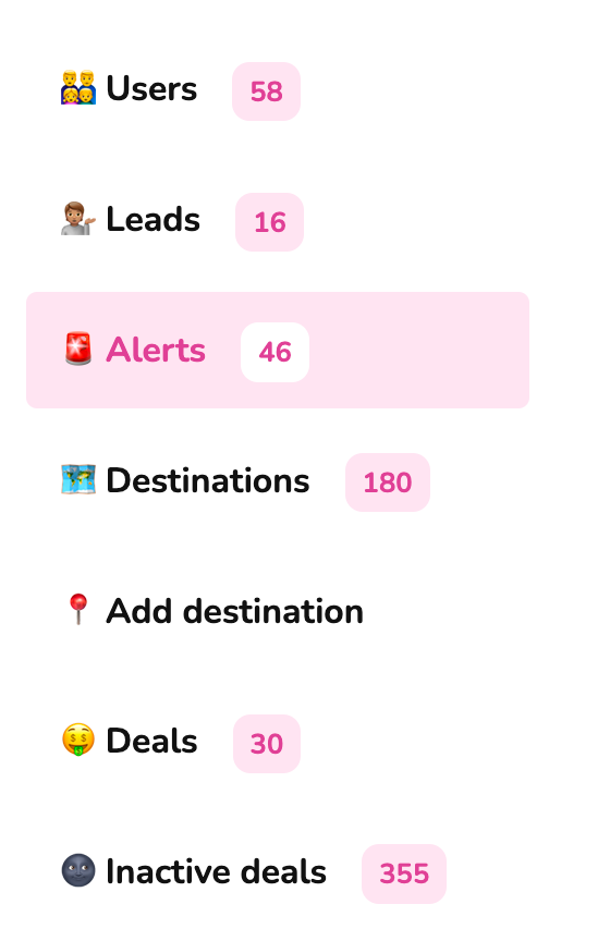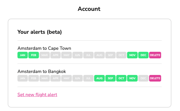 Die alerts zie ik in een mooi overzichtje en ik ga dan soms zelfs handmatig op zoek naar deals (ik krijg nog steeds DM’s van mensen met de vraag of ik even een vliegticket voor ze wil zoeken en kan nu reageren dat ik dat wel wil doen maar dat ze daarvoor eerst een account op Yelmair moeten maken).