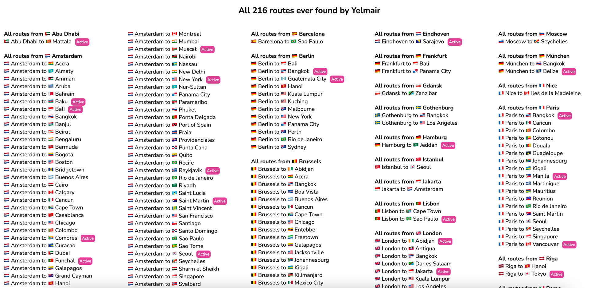 Yelmair toont slechts de 9 laatste deals aan niet-betalende gebruikers. De rest is pas te zien als je bent ingelogd en dat kan alleen met een betaald account. Maar als je helemaal naar beneden scrollt op de pagina, zie je alle links van alle routes die ooit zijn gepost. Als je dáár op klikt, kom je op de pagina terecht van die route. En aangezien er per route nooit meer dan 9 deals zijn, zie je per route dus altijd alle deals. Ha!