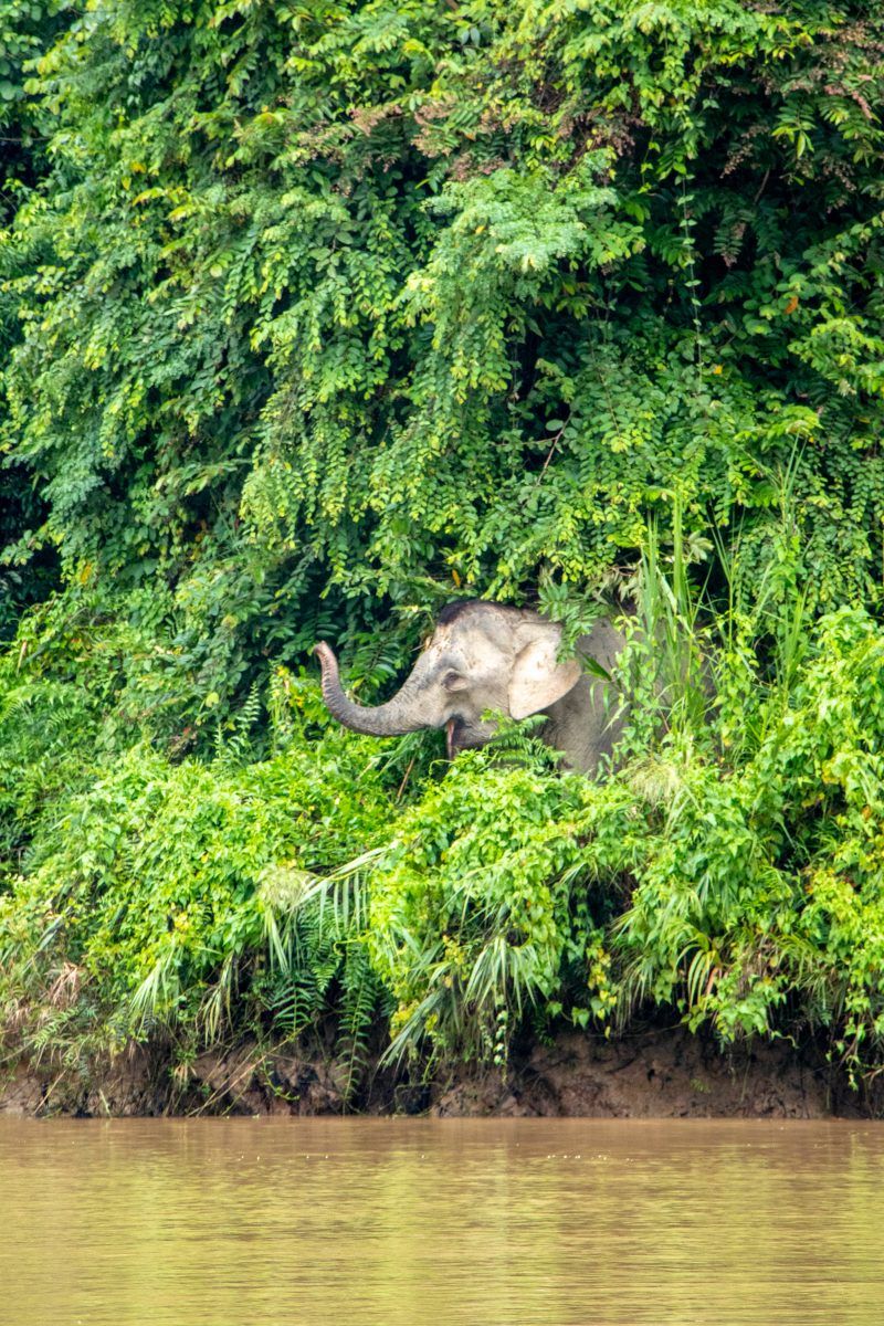 Daar zouden we een riviersafari gaan doen om vanaf die rivier allerlei dieren en natuurschoon te gaan bekijken. Dat lukte ook aardig, maar de gids vertelde ook dat zo’n beetje alles behalve de rivieroever inmiddels palmolieplantage was dus dat de lieve olifantjes en aapjes ook vrij weinig andere keuzes hadden dan rond de rivier hangen.