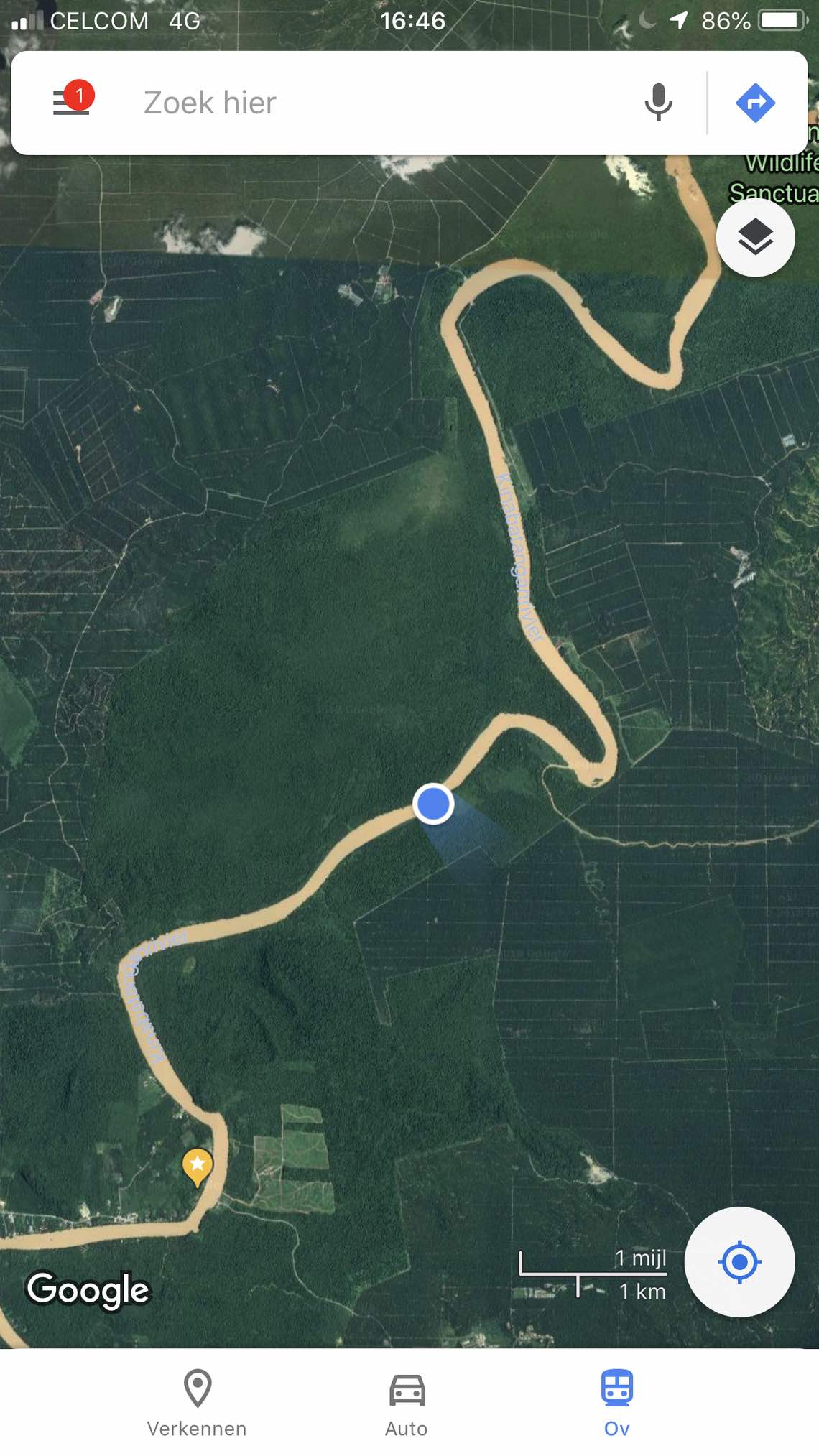De wilde vegetatie rond de oevers was dan ook letterlijk een prachtige façade. Door 4G-bereik leverde een check op Google Maps ook een bevestiging op: ik zag mezelf als blauw stipje op een bruin kronkelend riviertje met om me heen alleen maar wonderen der natuur: enorme neushoornvogels vlogen voorbij allerlei apensoorten en olifanten kwamen massaal gedag zeggen. Ik voelde me Young David Attenborough.