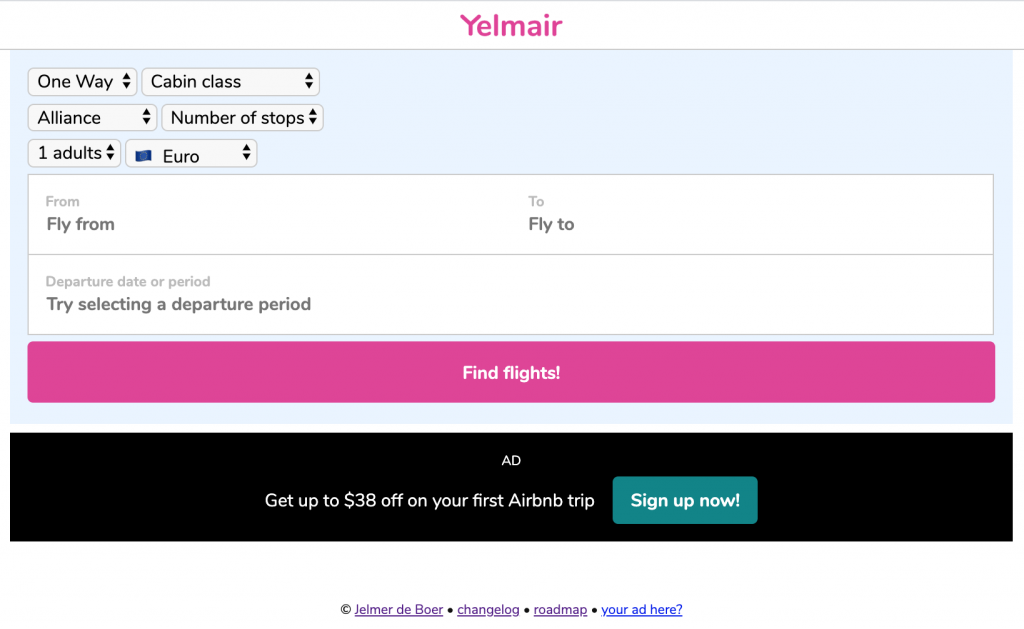 Deze website werd gelanceerd precies voor een coronapandemie die nogal wat roet in het eten van reizigers gooide (hoewel we natuurlijk gewoon nog steeds op reis kunnen). De enige dagelijkse gebruiker van Yelmair lijk ikzelf te zijn. Het is mijn favoriete tool voor het snel vinden van voordelige routes (en de hoeveelheid punten die ik kan sparen per vlucht).
