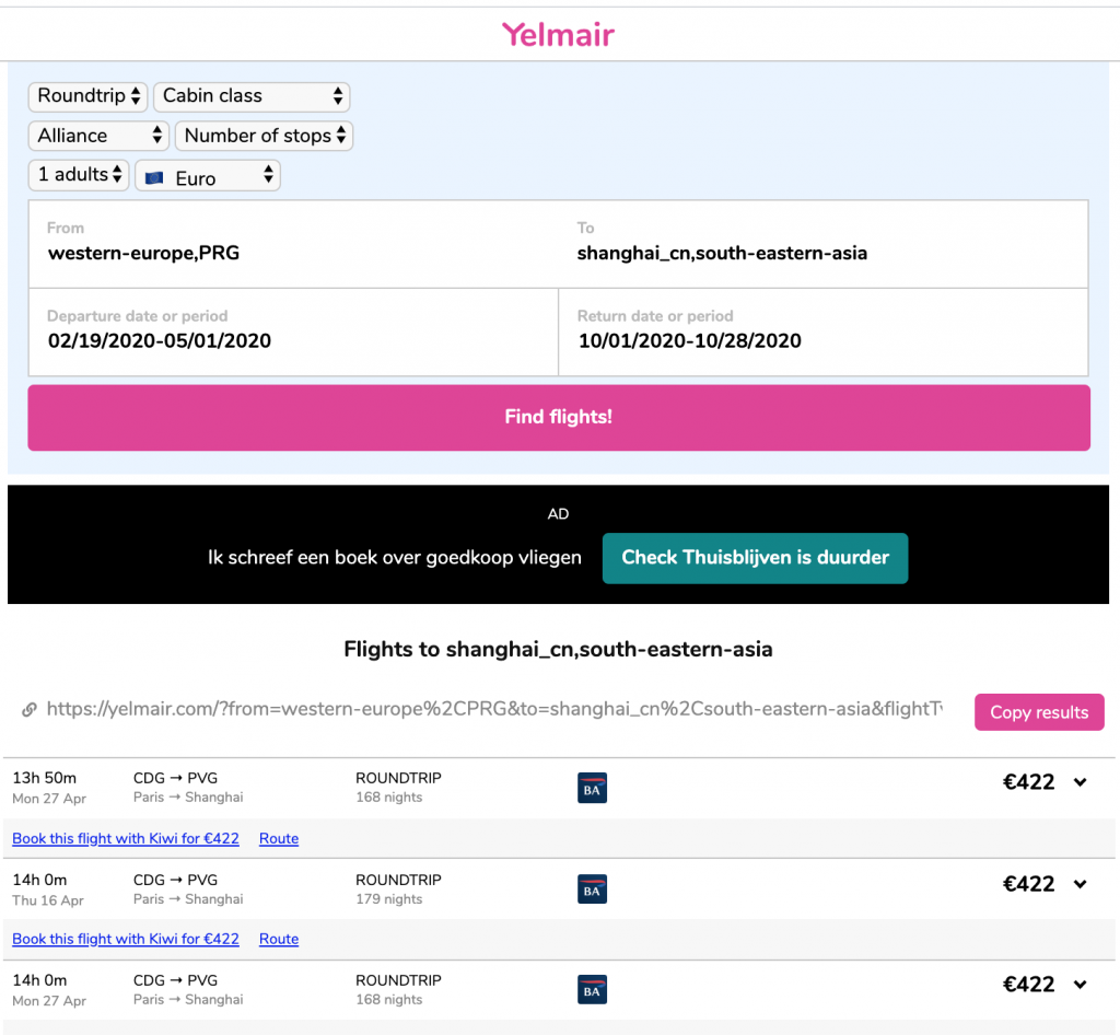 Dus in principe kun je gewoon zoeken van West-Europa en Praag naar Zuid-Oost Azië en Shanghai tussen nu en 1 mei en retour tussen 1 en 28 oktober. Dat is al iets wat maar weinig andere zoekmachines kunnen. Link hier.